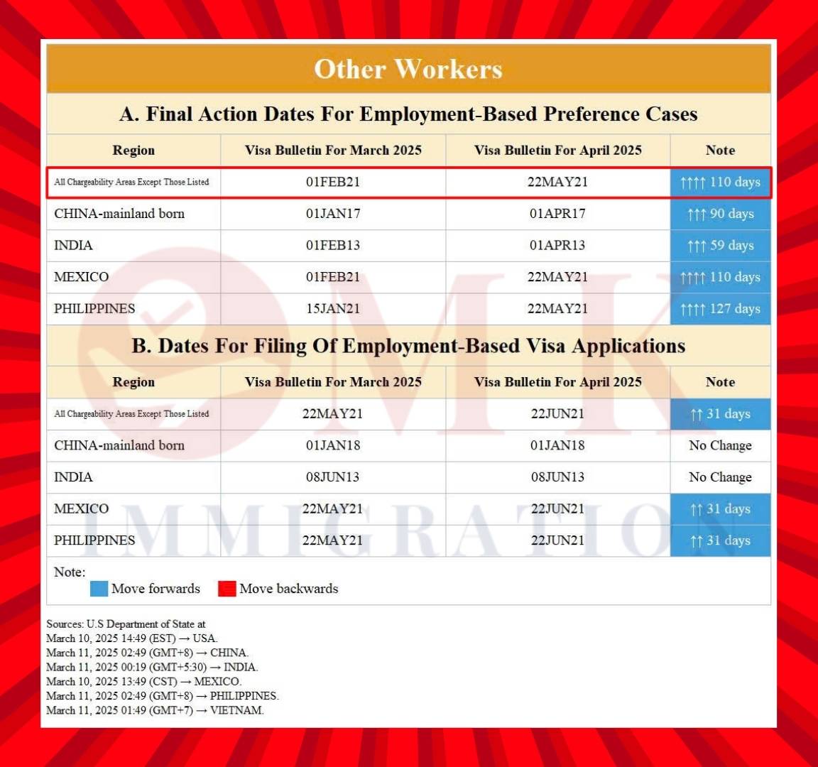 - All Chargeability Areas, Mexico & Philippines: Tăng 31 ngày (từ 22/05/2021 lên 22/06/2021).